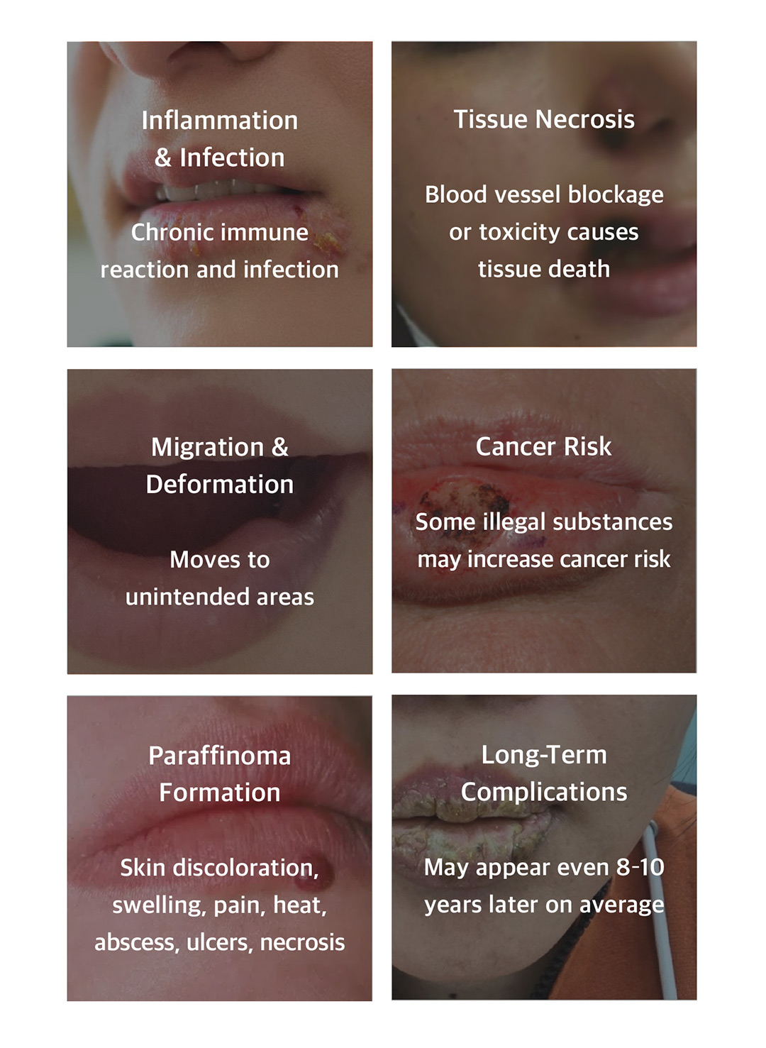 These are materials not approved for medical use or injected outside a licensed clinic. Examples include industrial silicone, paraffin, Vaseline, cooking oil, etc. These cause serious complications and must be removed.