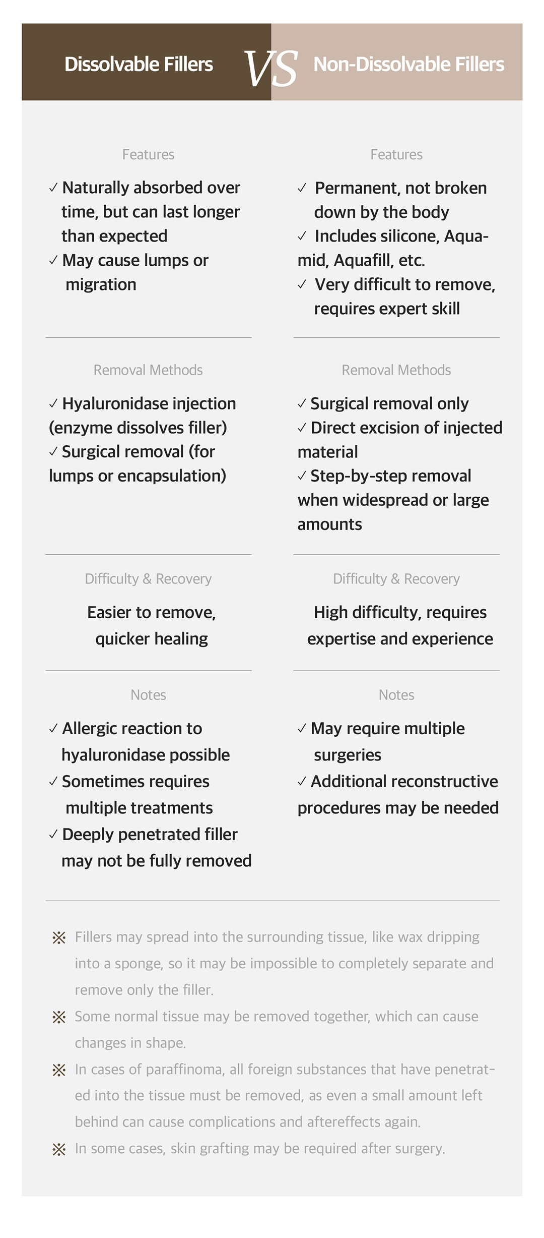 The method of removal depends on the type of material injected. In general, fillers are divided into dissolvable fillers and non-dissolvable fillers. Understanding the right approach for each type is the key to successful treatment.