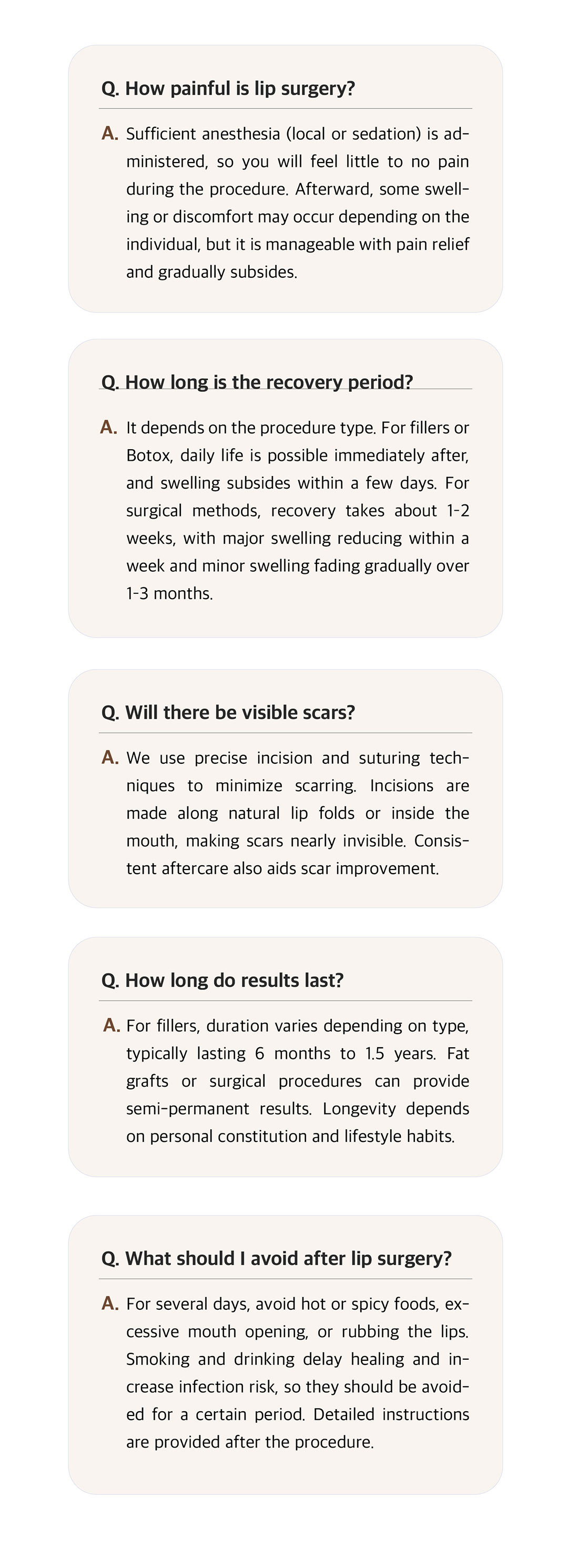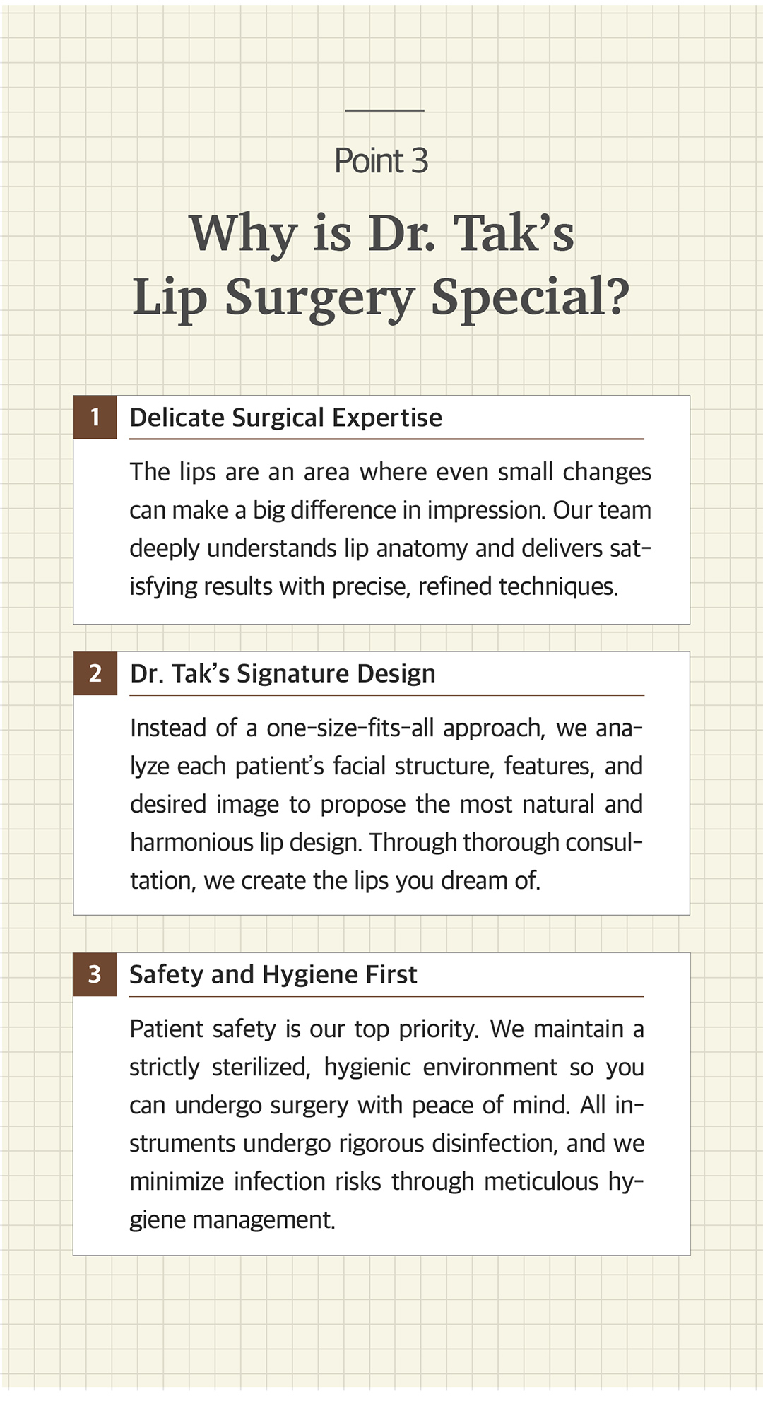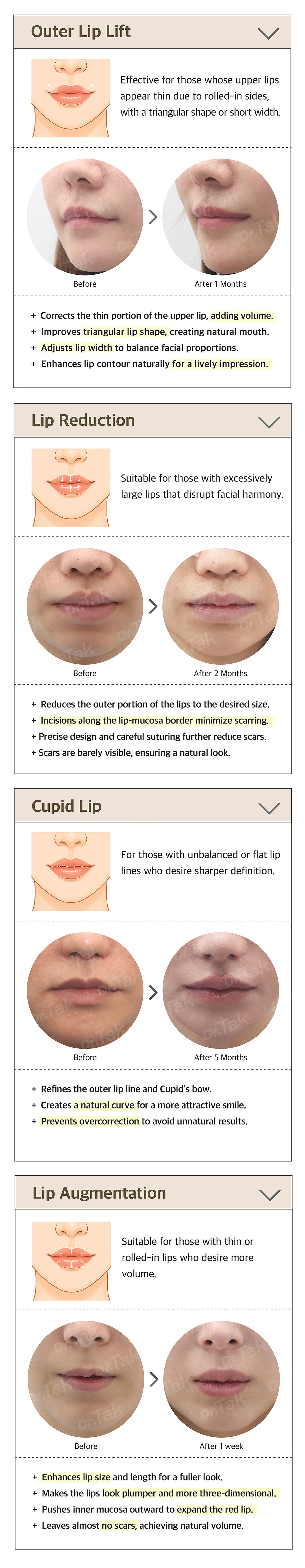 At Dr. Tak Plastic Surgery Clinic, we provide diverse surgical options tailored to each individual’s lip concerns. Our basic principles are: consideration of each person’s facial characteristics, essential consultation with a specialist, pursuit of natural results, and the importance of post-procedure care.