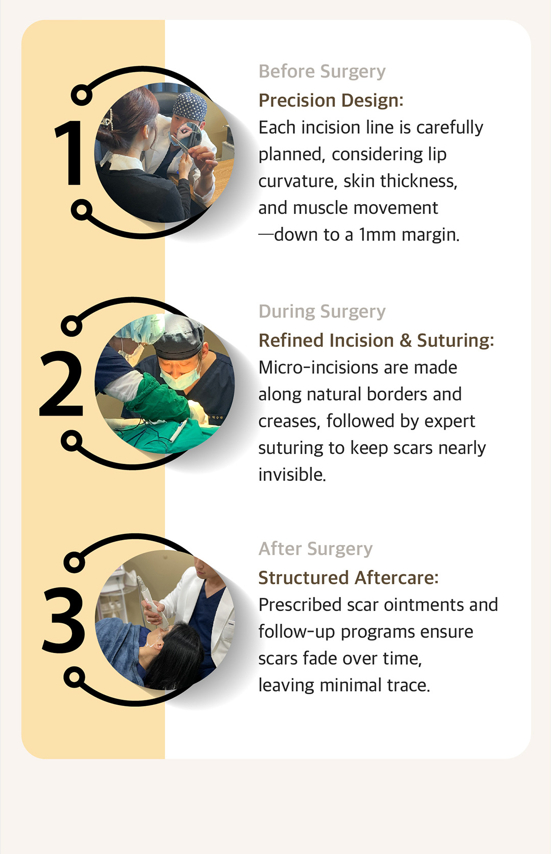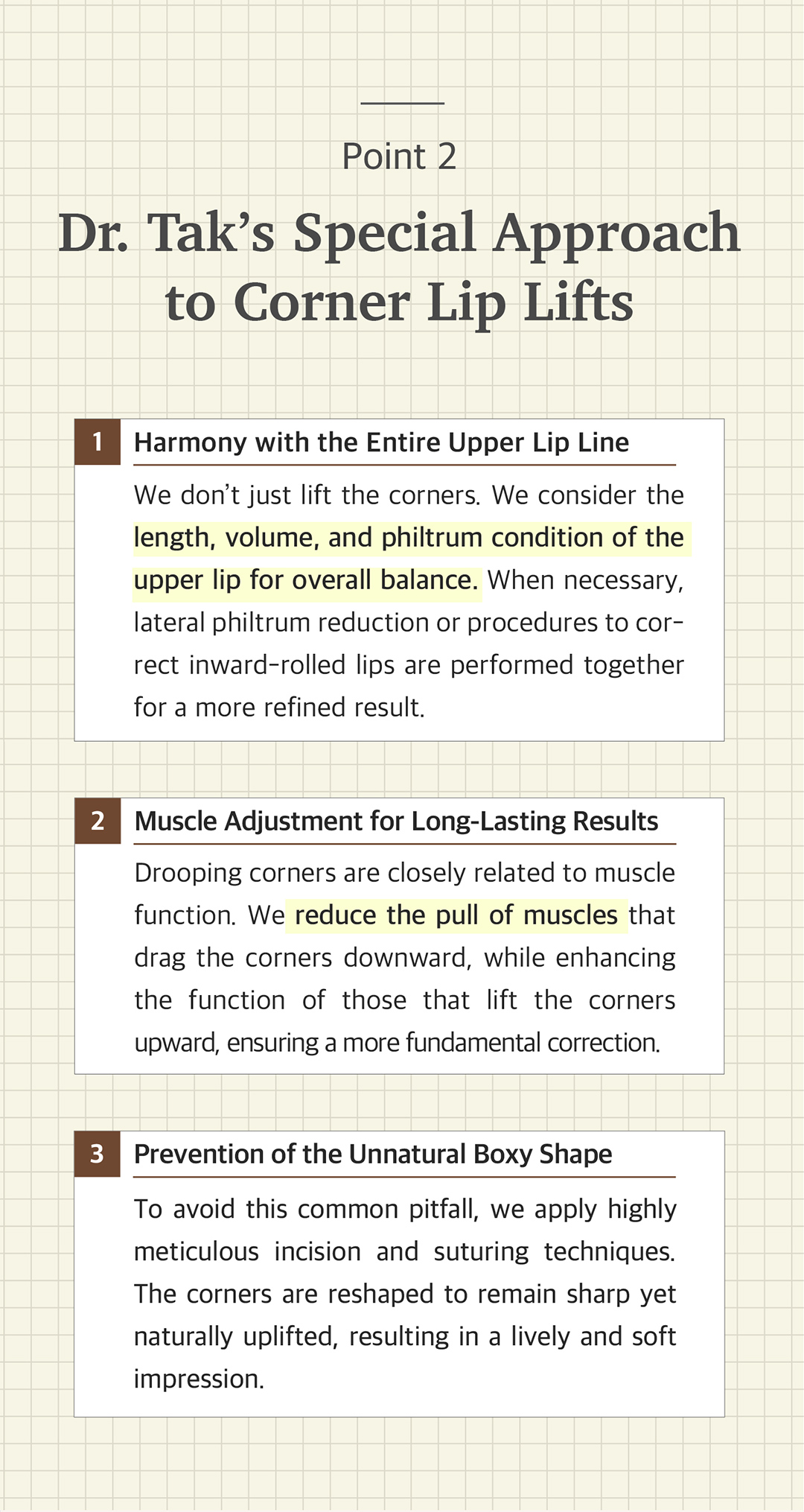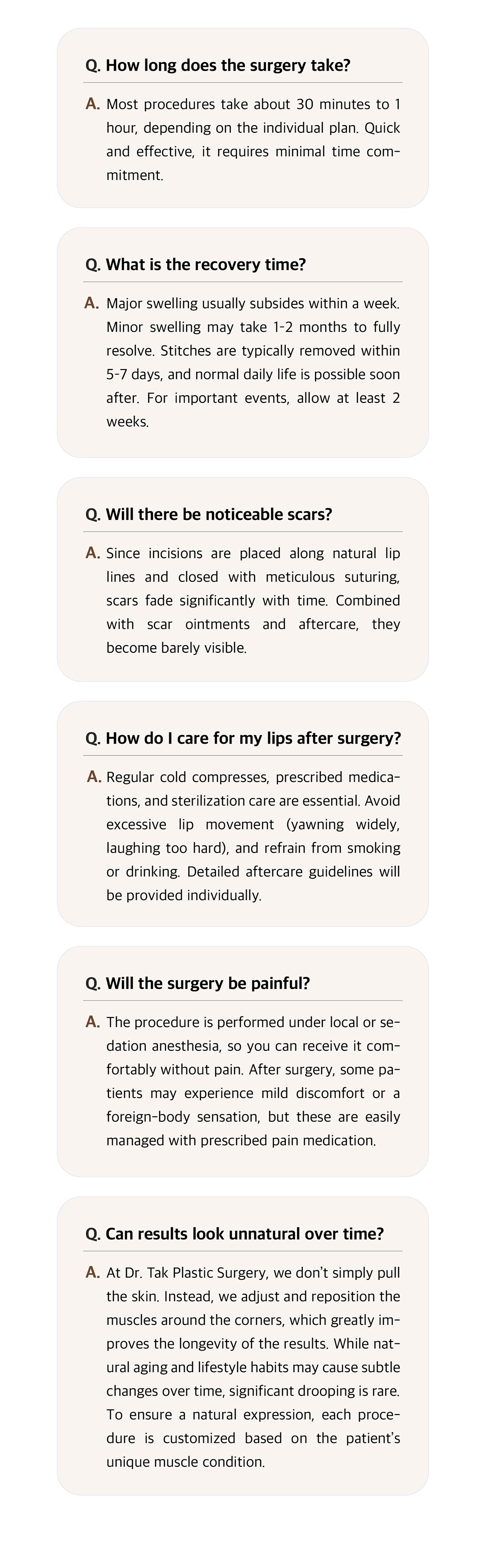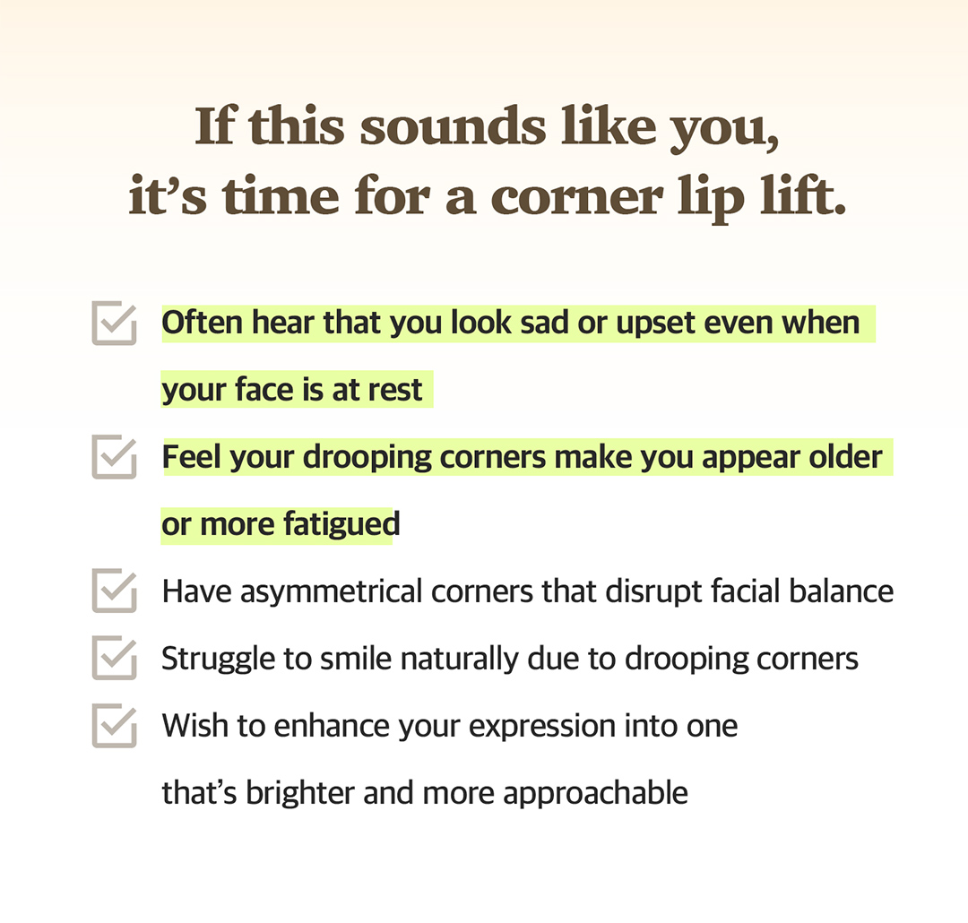The corner lip lift is a delicate surgery that corrects drooping or asymmetrical lip corners, creating a brighter and more approachable expression. By slightly elevating the corners and balancing the surrounding muscles, the procedure achieves a natural, effortless smile.